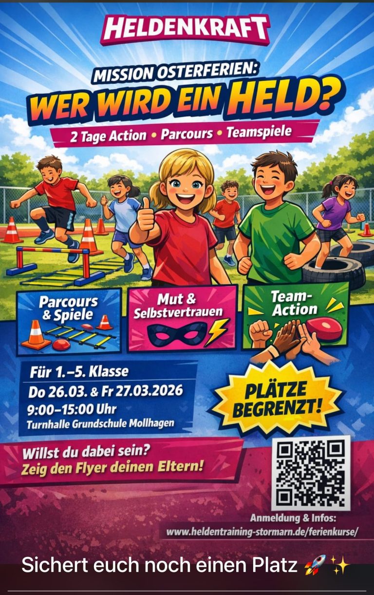 Dann ist unser Osterferienkurs genau das Richtige: Betreuung von 9:00–15:00 Uhr in der Turnhalle der Grundschule Mollhagen – mit viel Bewegung, Spiel, Spaß und vor allem: echter Stärkung fürs Leben.